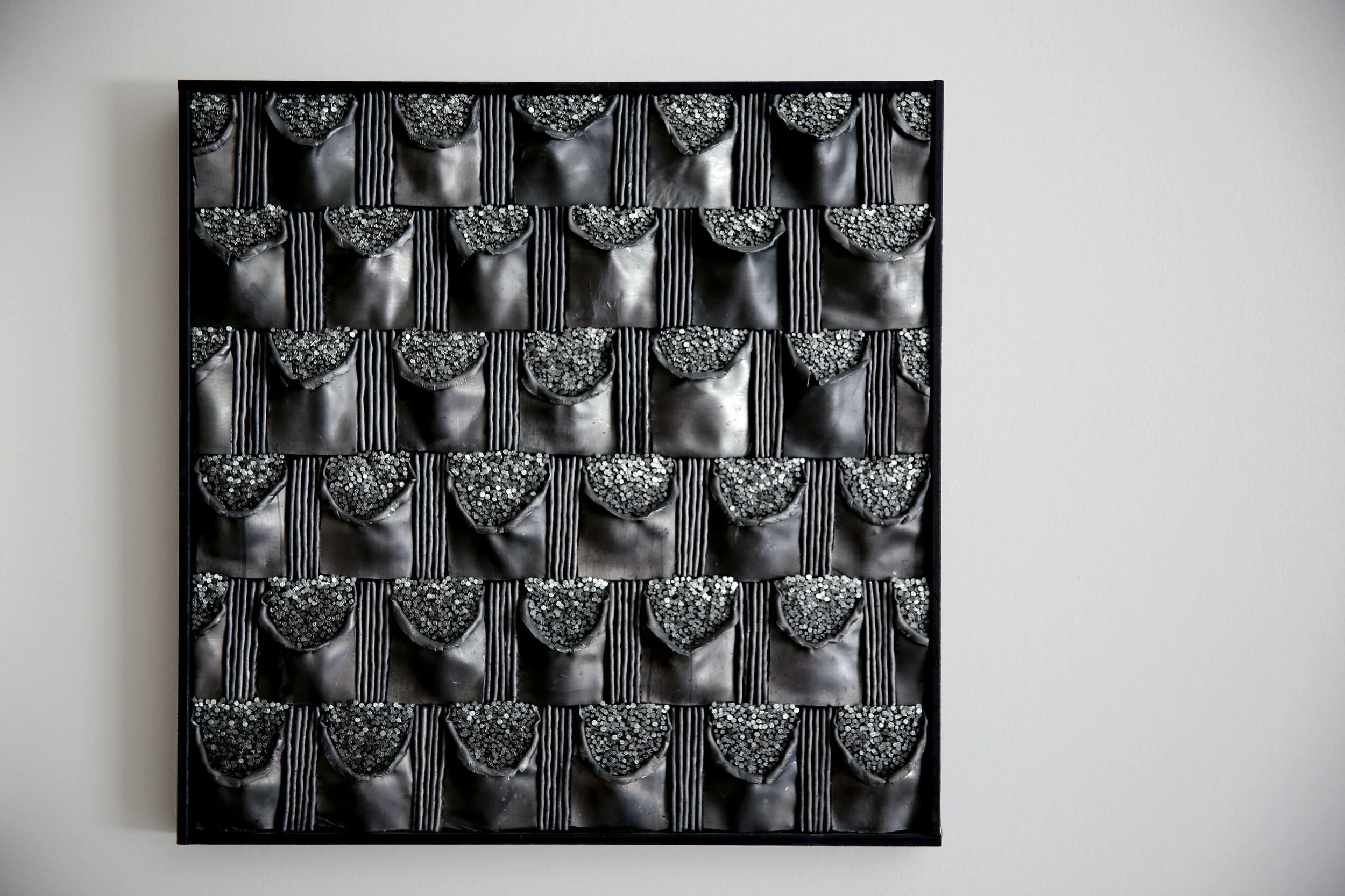 Pockets was an exercise in abnormal materials. I was a student when I made this piece, and the assignment was to make something inspired by a textile. I had found an image of some very loopy crochet or knit (something with yarn) that I found interesting, and decided to work based on that. I cut each pocket out of lead sheet - I never knew how many beautiful colors lead can have before this project! - and rolled back the edges; I built a styrofoam base for each one, and filled the “pocket” area by pushing small nails into it. Then I filled the space between each pocket with 5 strips of lead folded in half. It was a fairly tedious process, but as they say, beauty takes time.